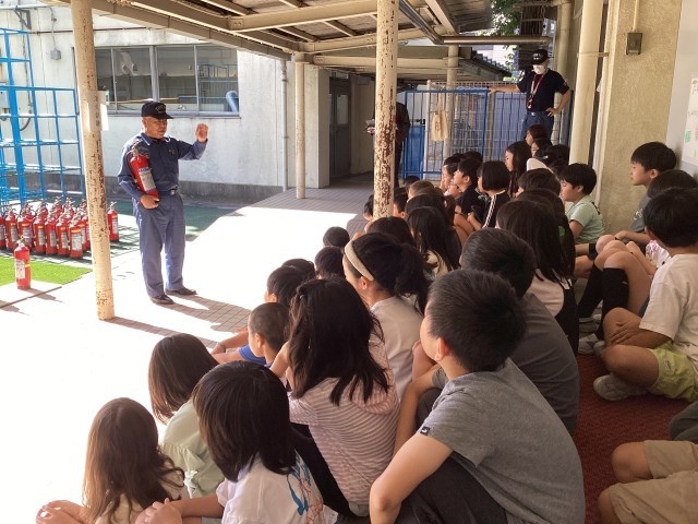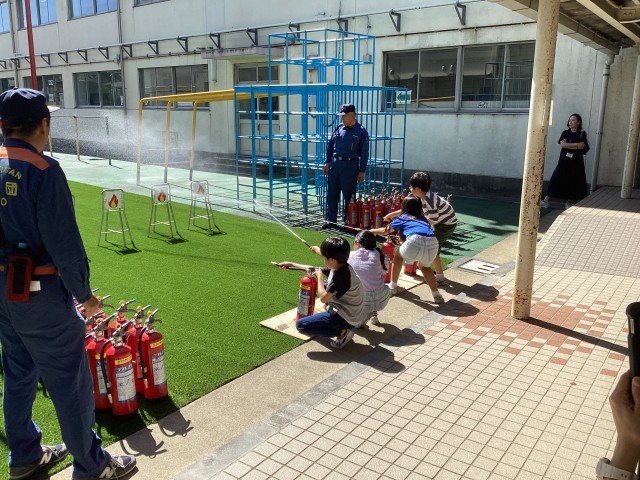 消化体験では、消化器の使い方を学び、実際に水が入った消化器で練習を行います。