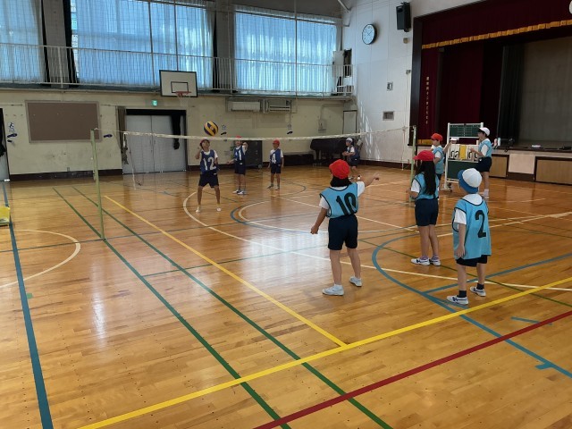 ソフトキャッチバレーボールの試合です。ネット越しにボールをキャッチします。トスをあげて、アタックして相手陣地の打ち込みます。