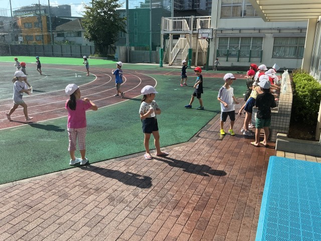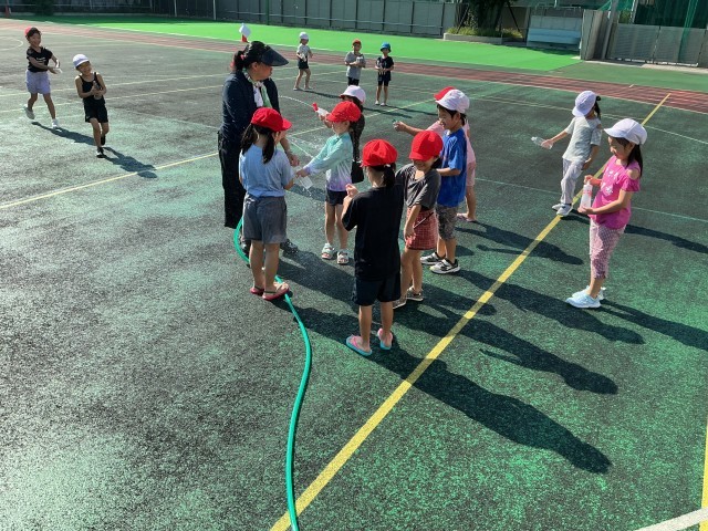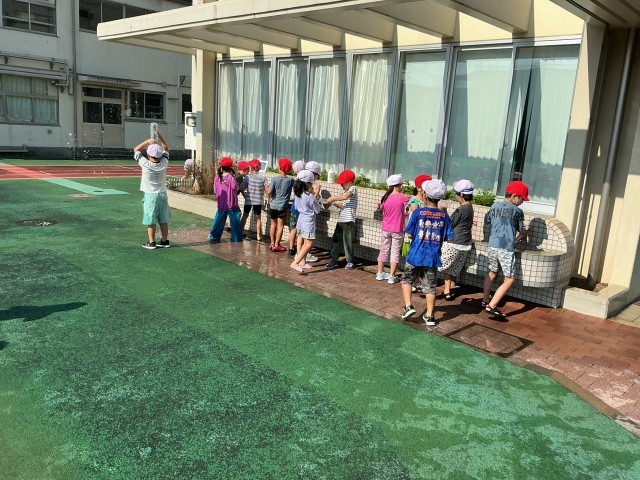 ペットボトルやビニールに水を入れて、お友達とかけあったり、先生を追いかけたりして、楽しい時間を過ごしていました。