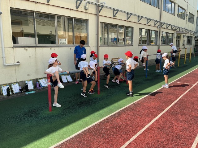 鉄棒を使った運動遊びでは、それぞれの課題に応じた技を練習していました。