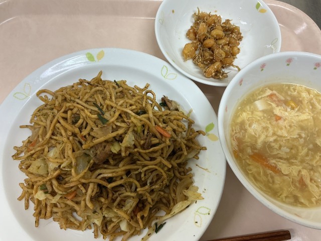 献立 ソース焼きそば 中華風コーンスープ 大豆とじゃこの甘辛あげ 牛乳
