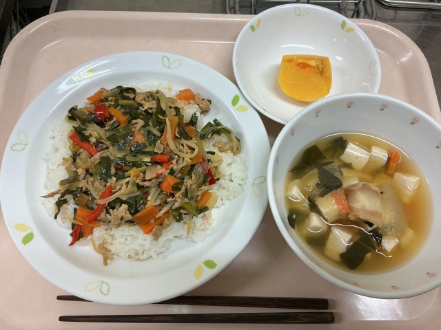 献立 プルコギ丼 冬瓜の汁物 柿 牛乳