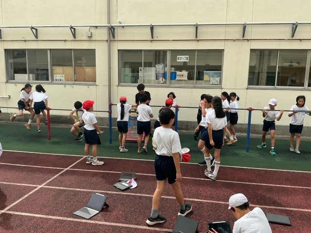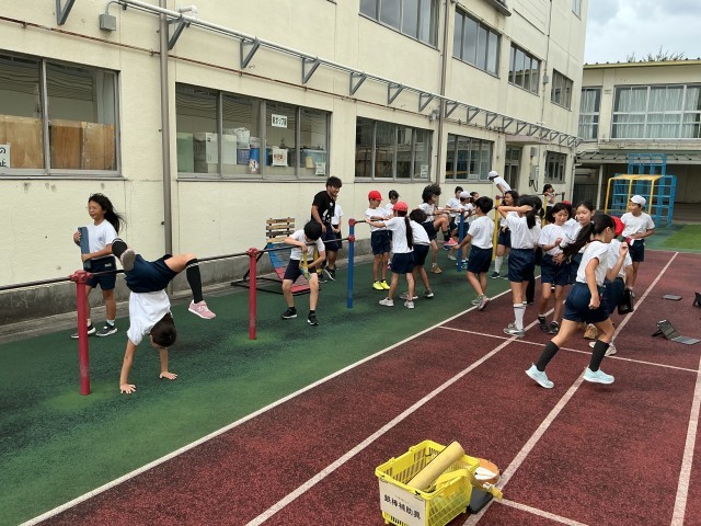 鉄棒に取り組んでいます。いろんな技に挑戦してしたり、器具を使ったり、楽しんで活動していました。