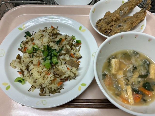 献立 豚肉とごぼうのごはん きゃべつの味噌汁 ししゃものごまあげ 牛乳