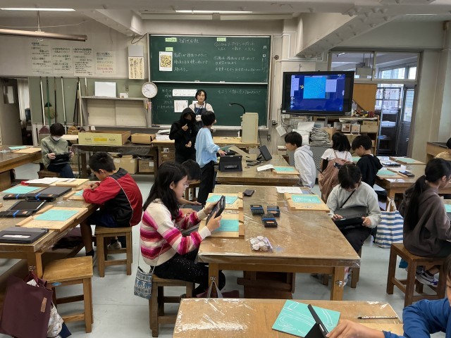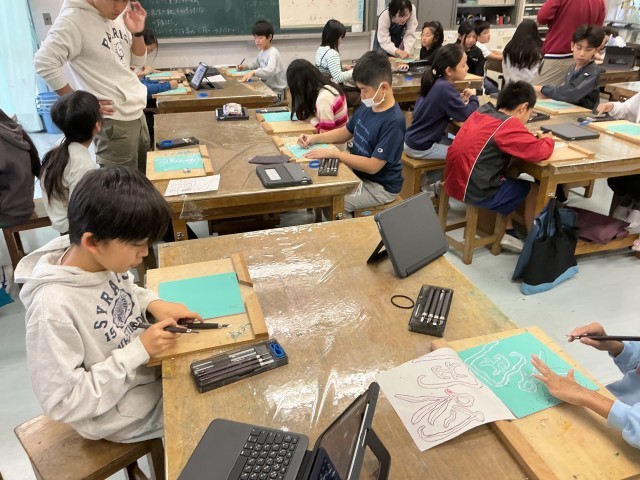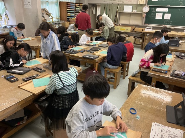 字そのものがしっかり目立つように、縁取りの線はしっかり掘る。模様のデザインは、薄めに彫っていく。など先生から大事な助言を受けながら、それぞれに生き生きと活動を進めました。
