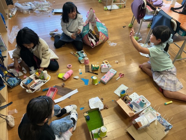 「あそんでつくって」持ち寄った材料を使って、遊び道具を作ります。そして飛ばしたり、ころがしたり、おままごとをしたり、自由に遊びます。楽しくないはずがありません。みんな夢中になって取り組んでいました。