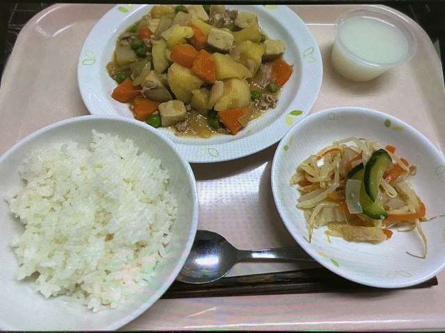 献立 ごはん 肉じゃがうま煮 こんにゃくサラダ ホワイトゼリー 牛乳