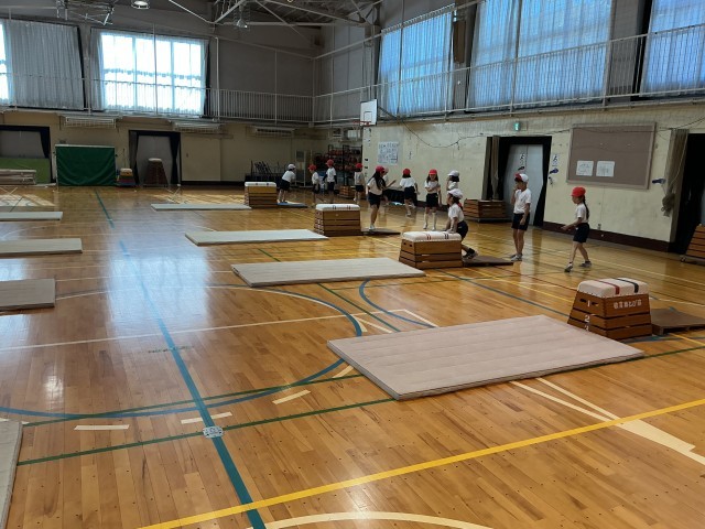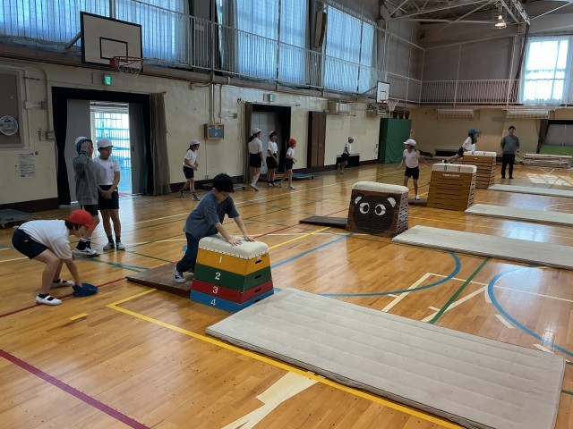 とび箱。練習風景です。補助運動として、跳び箱に手を置き、足をジャンプして叩く(カエル足)運動をしていました。