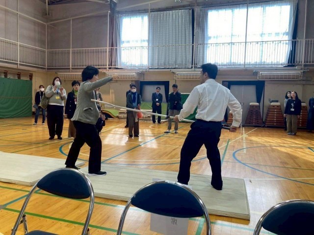 また、護身術として、手をつかまれたときの逃れ方や、さすまたの使い方なども実演していただきました。