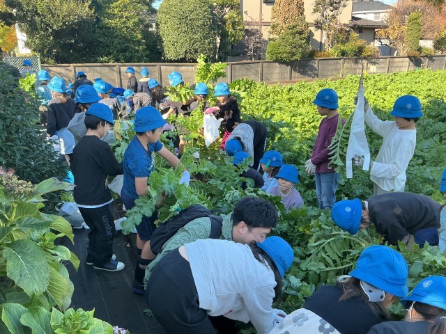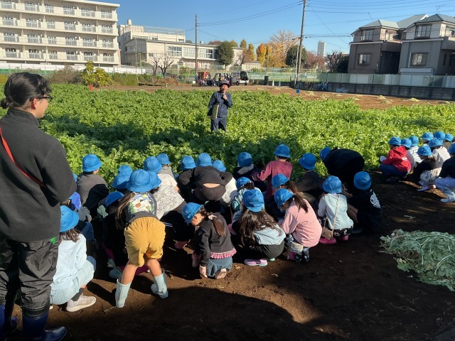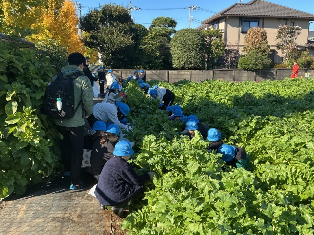 大きく育った大根を葉を束ねながら、引っこ抜きました。抜けない場合は、周りの土をかき分けていくと、抜けやすくなります。「抜けた〜!」「わあ、おっきい!」歓声が次々とあがりました。