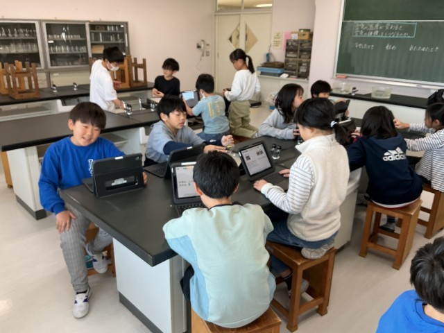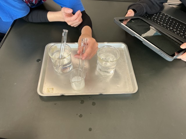 石けん水で試験管に膜を張り、それをお湯につけたり、氷水につけたりすると、膜がどう変化するかを実験していました。