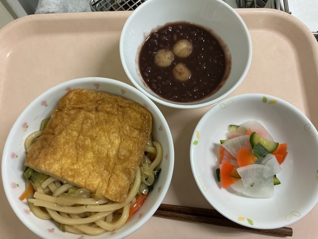 献立 おおきなおあげのきつねうどん 大根の酢の物 白玉しるこ 牛乳