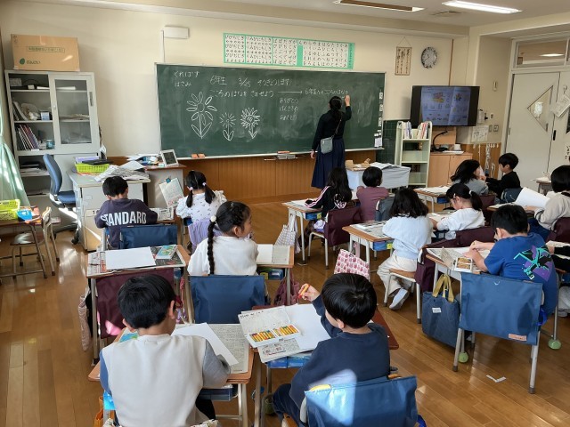 卒業生への「心の花をさかせよう」というテーマで、画用紙いっぱいにお花を描いています。