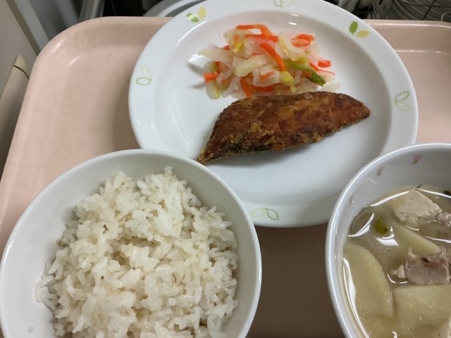 献立 雑穀ごはん ぼらのから揚げ 白菜酢のもの 具沢山味噌汁 牛乳