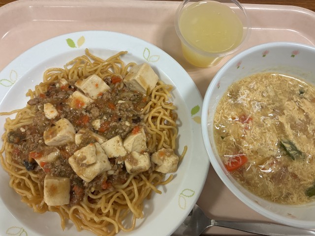 献立 麻婆焼きそば かきたま汁 ミックスゼリー 牛乳