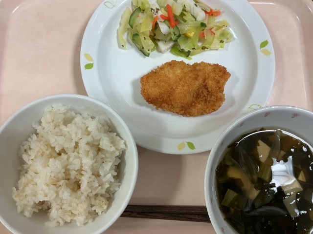 献立 むぎごはん チキンカツ イカとキャベツのガーリックあえ わかめスープ 牛乳