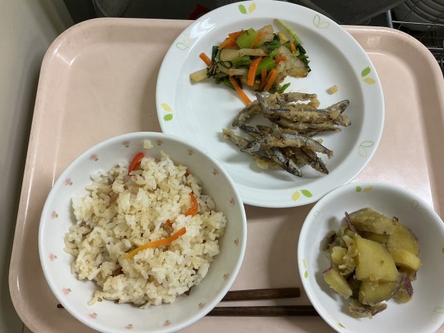 献立 豚肉と昆布のごはん きびなごのから揚げ 野菜の乾物(のり・おかか)あえ