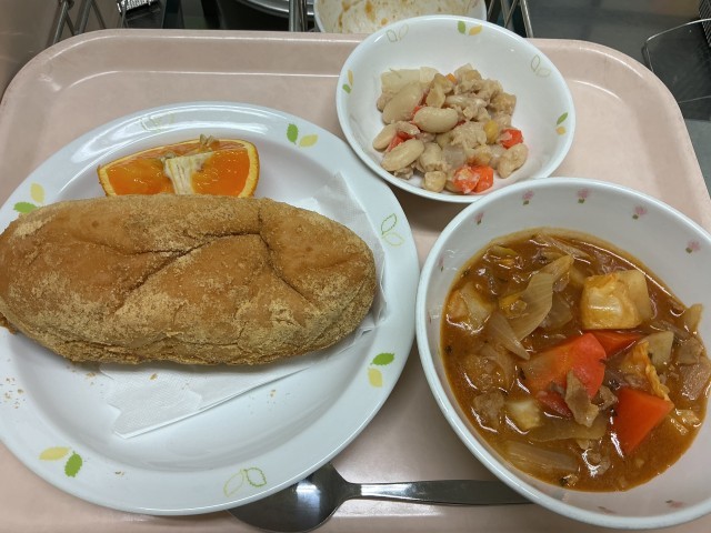 献立 あげぱん ボルシチ風 白いんげん豆とツナのサラダ 清美オレンジ 牛乳