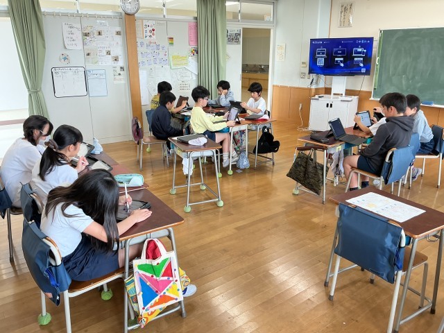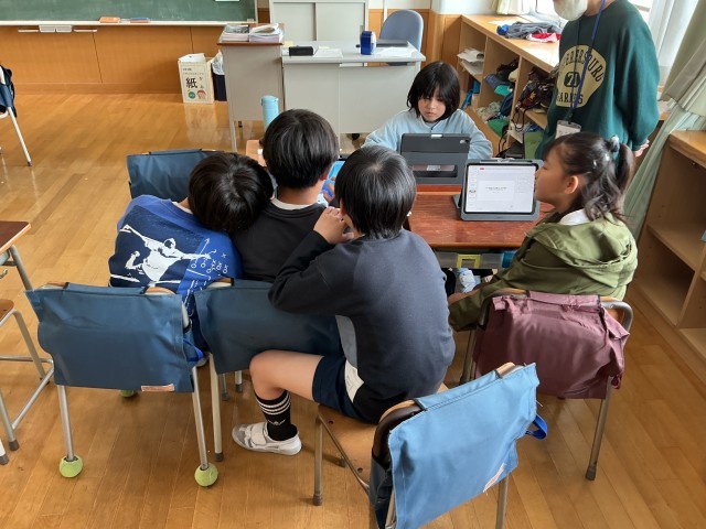東京の離島の特徴を、グループごとに調べていました。海や山の様子、観光、レジャーなど、調べたいテーマに沿って友達と調べ学習を進めていました。