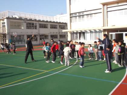 そのあと、朝遊びの時間がありました。各学年ごとに、たからさがし、色おに、大縄などをして遊びました。4年生と6年生は、合同で学年対抗ドッジボールを行っていました。