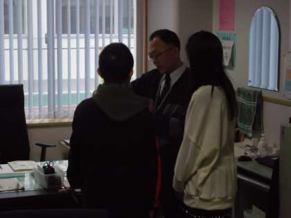 毎朝、各クラスの日直が、校長室に学級の出欠と健康状況の報告に来ます。校長からは、学級へ伝えてほしいメッセージを話します。