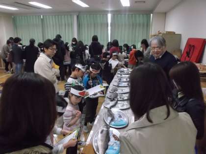 2年生は、食育の一環として、お魚について勉強しました。たくさんの種類の魚が部屋に並べられ、特徴を観察することができました。
