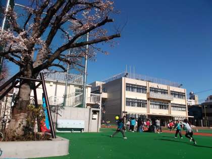 校庭では、桜や菜の花がとてもきれいに咲いています。春爛漫の中、元気に子どもたちは遊んでいます。