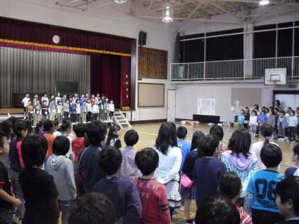 一年生を迎える会を行いました。2年生以上の子どもたちは、1年生に学校について分かりやすく伝えるために芝居仕立てにしたり、クイズ形式にしたり、各学年で工夫を凝らしました。1年生は上学年へのお礼に呼びかけと合唱「にじ」を歌いました。最後は今年度初めて、全校で歌った校歌が体育館に響き渡りました。
