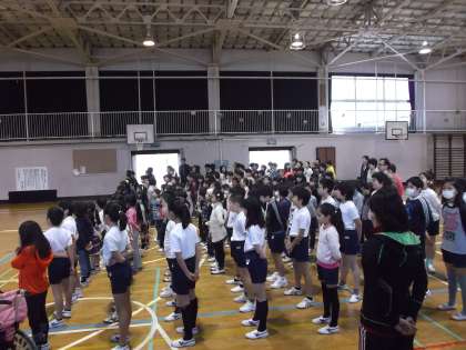 1年生が初めて朝会に参加しました。お話をしっかりときくことができました。