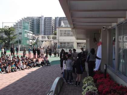 4月22日13:30より、ユネスコスクールプレートの除幕式を、目黒ユネスコ協会の方、先進校の校長先生他、近隣のPTA会長、地域の方、保護者の方など多くの方にご参加いただき、盛大に会を行うことができました。