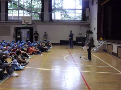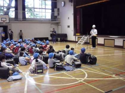 今日は、PTA校外委員の皆様はじめ多くの保護者の皆様の協力を得て、校外班活動、避難訓練を実施しました。学区内に不審者が潜伏している可能性があるという想定のもとに、安全に下校する集団下校をしました。