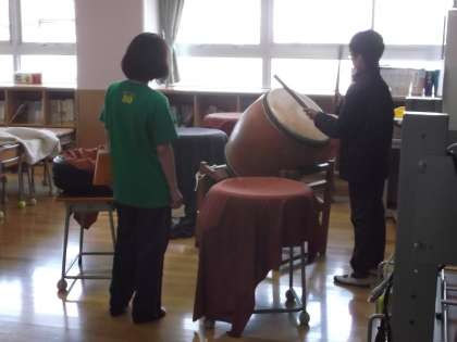休み時間、中里音頭の太鼓をたたく子どもが練習をしていました。また、リズム縄跳びに挑戦する中学年は、苦手な技の練習を休み時間に行っていました。