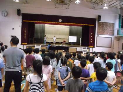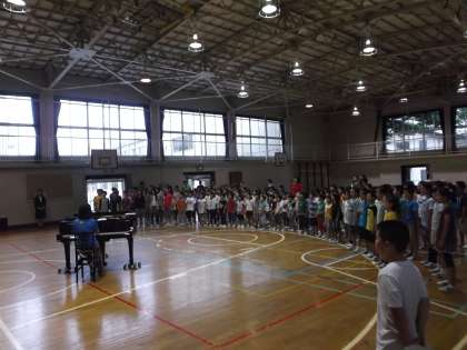 途中、学年ごとに歌のリレーをしました。低学年はかわいらしい歌声で、中学年は元気な歌声で、高学年は美しい歌声で響きました。