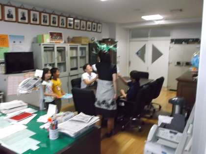 日直の出席報告を校長先生にしたあと、校長先生から、竜巻がおこる仕組みを図解資料とすずらんテープ・うちわを使った実験で日直に伝え、学級に説明するよう依頼しました。