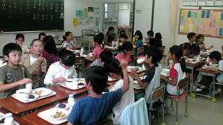 二学期最初の給食。どの学年も美味しそうに食べていました。メニューは、中華丼、ワカメスープ、ぶどう、牛乳です。