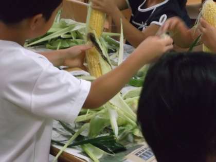 今日の献立「むきとうもろこし」のとうもろこしを、1時間目に1年生が皮むきしました。