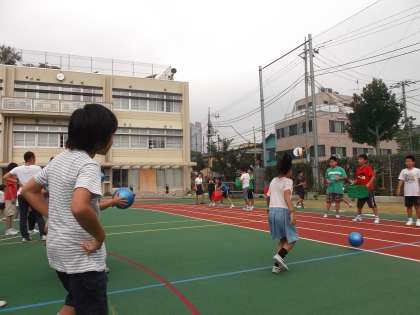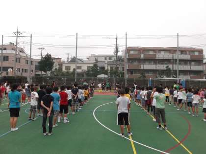 今日の児童集会は、たてわり班対抗、リレー玉入れを行いました。各班の班長が代表でかごをもち、班のメンバーがはなれたところからボールを投げ入れます。ちゃんと入った数で競い合いました。