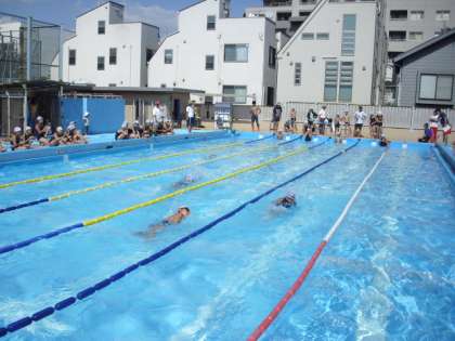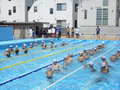 子どもたちに負けないほど元気いっぱいの快晴の空のもと、5・6年生による水泳記録会が開催されました。