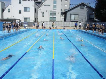 冒頭、校長先生から「隣で泳ぐ友達は自分を励ましてくれる大切な友達です。自分自身に挑戦する気持ちをもって精一杯泳ぎきってください。」とお話がありました。