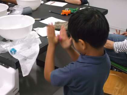 布が水を吸い込む仕組み、水性インクの色によって、繊維の吸着度が違うこと、羊毛の縮みを利用したフェルト作りなど、楽しい実験を親子で楽しみました。