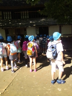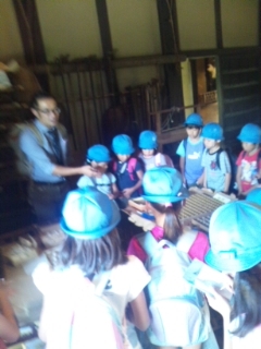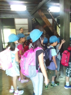 三年生が社会科見学で、次太夫掘公園に来ました。昔の生活の様子を学習しました。