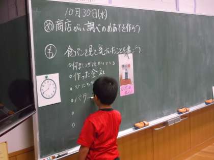 「買い物調べをしよう」の1時間目でスーパーマーケットや商店の商品を比較して、学習の問題を見付けることを目当てに行いました。
