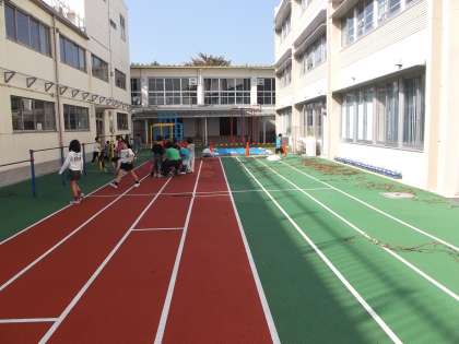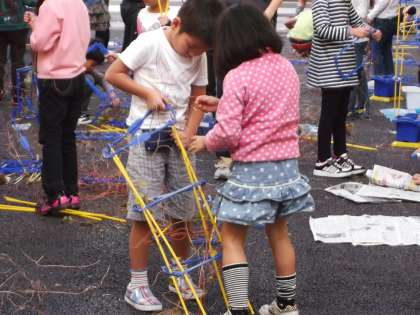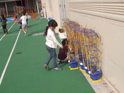 よい天気となりました。その中、1年生はアサガオの蔓を、2年生はさつま芋の蔓をつかった次の学習に入りました。