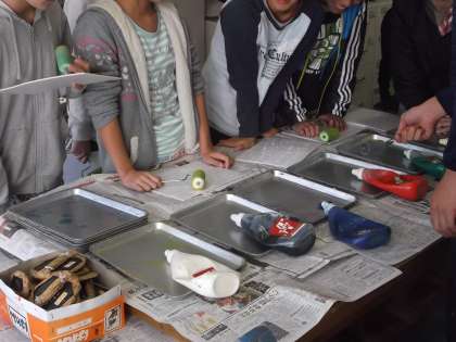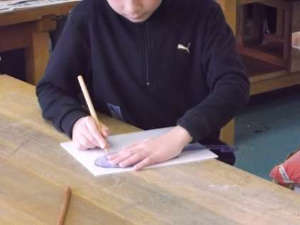 スチレンに思い思いの模様を、とがったものやマジックペンのふた、やすりなどでへこみをつていきます。これが版となり、ローラーで彩色して版画にしていきます。
