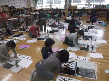 書き初めは3年生から毛筆になります。今日は教室の床面に半紙を広げて、大きな文字を書くことに挑戦していました。