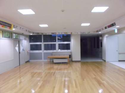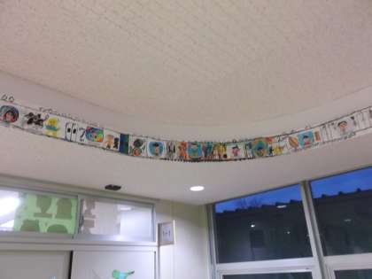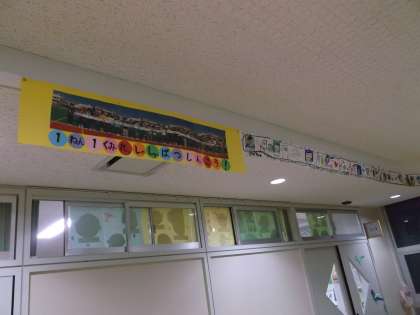 1年教室の前のホールの天井に、「1ねん1くみれっしゃ しゅっぱつしんこう」が掲示されています。図工の時間に作成したものです。