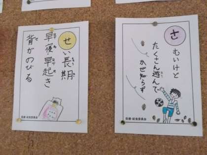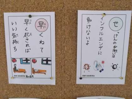 保健給食委員会の子どもたちが、けんこうかるたを作りました。今、保健室前に掲示しています。