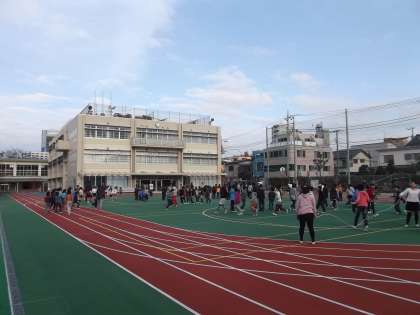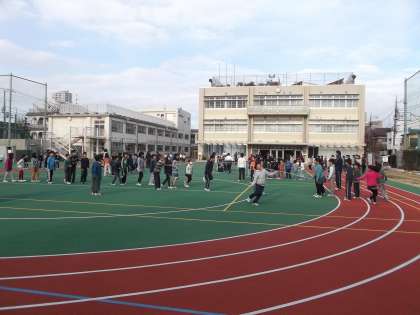ソチオリンピックも間もなく開催です。今日は、運動集会を行いました。各学年ごとに大なわ八の字跳びに挑戦しました。