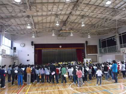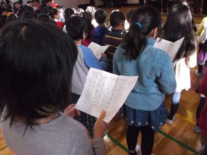 雪の残る冷え込んだ朝でした。その中、体育館で全校の詩の朝会を行いました。今日は6年生が当番でした。「自分の一歩」という詩を、6年生が中心となって、全校で読みました。
