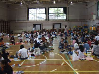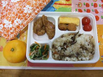 今日の給食はたてわり班でのお弁当給食でした。ゴミをたくさん出さないために、今年はマイ箸と水とうを持参しました。体育館でみんなで食べたお弁当給食は、いつもの給食とは一味違った美味しさだったようです。